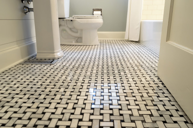 And while we're here, lets talk about this floor! It is a marble basket weave tile from Lowe's. Kind of spendy but when you are remodeling a small space you can go for higher quality finishes because you simply don't have to buy that much of it. We used a charcoal gray grout to make it easier to *appear* clean. I love how the light bounces off of it. This tile felt like an easy choice in the bathroom since it seemed to match the house and the bathtub and the pedestal sink.
